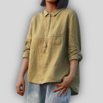 Classic linen blouse that exudes discreet elegance and everyday comfort. It features a classic collar with buttons on the front and a practical chest pocket. The relaxed fit and long sleeves with roll-up options make it ideal for all hours of the day.