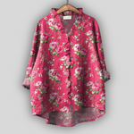 Ρομαντική λινή μπλούζα σε έντονη ροζ απόχρωση με λουλουδάτο μοτίβο από τριαντάφυλλα που αποπνέει θηλυκότητα και κομψότητα. Η V λαιμόκοψη με διακριτικά βολάν και η χαλαρή εφαρμογή προσφέρουν άνεση και αέρινη αίσθηση, ενώ το ασύμμετρο τελείωμα με πιο μακρύ πίσω μέρος προσθέτει μοντέρνο χαρακτήρα σε κάθε εμφάνιση.