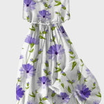 Αυτό το κομψό μάξι φόρεμα με λευκή βάση και μωβ λουλούδια αποπνέει φρεσκάδα και θηλυκότητα. Το ελαφρύ ύφασμα και η ανάλαφρη εφαρμογή του το καθιστούν ιδανικό για τις ανοιξιάτικες και καλοκαιρινές εμφανίσεις σας.