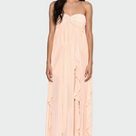 Κομψό μάξι φόρεμα με ρευστή κίνηση και θηλυκή γραμμή που αγκαλιάζει απαλά τη σιλουέτα. Το εκλεπτυσμένο ντεκολτέ και οι λεπτές τιράντες αναδεικνύουν τον λαιμό και τους ώμους, ενώ η εφαρμογή στη μέση προσφέρει κομψό σχήμα. Ιδανικό για γάμους, βαπτίσεις και κάθε ιδιαίτερη περίσταση.