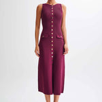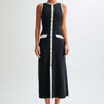 Κομψό πλεκτό φόρεμα χωρίς μανίκια με κουμπιά σε όλο το μήκος. Η ίσια γραμμή του χαρίζει διαχρονική κομψότητα, ενώ οι τσέπες με κουμπί προσθέτουν μια εκλεπτυσμένη λεπτομέρεια. Ιδανικό για εμφανίσεις από το πρωί μέχρι το βράδυ.