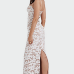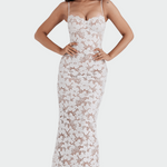 Ένα εκλεπτυσμένο μάξι φόρεμα με δαντέλα σε floral σχέδιο που αναδεικνύει τη θηλυκότητα με κομψότητα και διαχρονικό στυλ. Οι λεπτές τιράντες και το εφαρμοστό κόψιμο αγκαλιάζουν αρμονικά τη σιλουέτα, κάνοντάς το ιδανικό για βραδινές εμφανίσεις ή ξεχωριστές περιστάσεις. Η διάφανη υφή της δαντέλας χαρίζει αίσθηση πολυτέλειας και ρομαντισμού.