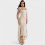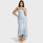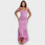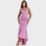 Αυτό το υπέροχο μακρύ φόρεμα σε απαλό λιλά χρώμα συνδυάζει κομψότητα και θηλυκότητα, με ρομαντικές λεπτομέρειες και εφαρμογή που αγκαλιάζει το σώμα. Ο κορσές με ντραπέ σχέδιο αναδεικνύει τη μέση, ενώ η ασύμμετρη φούστα προσθέτει κίνηση και χάρη σε κάθε σας βήμα.