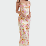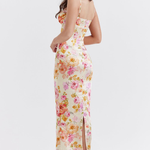 Ένα εντυπωσιακό μάξι φόρεμα με floral μοτίβο που αποπνέει θηλυκότητα και κομψότητα. Το εφαρμοστό του κόψιμο αναδεικνύει τη σιλουέτα, ενώ το ντεκολτέ με λεπτές τιράντες χαρίζει μια αίσθηση διακριτικής γοητείας. Ένα κομμάτι που συνδυάζει ρομαντισμό και πολυτέλεια, ιδανικό για ξεχωριστές περιστάσεις.