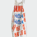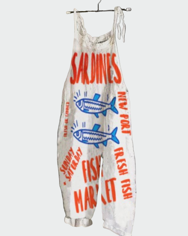 Το Fish Market είναι μια ιδιαίτερη και παιχνιδιάρικη ολόσωμη φόρμα που θυμίζει vintage αφίσα από ψαραγορά. Οι έντονες κόκκινες και μπλε λεπτομέρειες με τις λέξεις “SARDINES”, “FRESH FISH”, “FISH MARKET” σε συνδυασμό με τα γραφικά ψάρια δημιουργούν μια έντονη και μοναδική εμφάνιση.