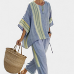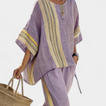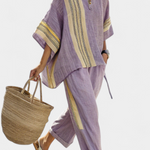 Σετ από λινό μπαμπού με μαγευτική λεβάντα και λεπτομέρειες σε κίτρινη ρίγα