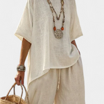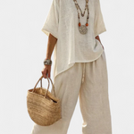 Καθαρή απλότητα με φυσική κομψότητα. Το σύνολο Daisy ξεχωρίζει για τη χαλαρή και μονοχρωμία σιλουέτα του, ιδανικό για όσους αναζητούν άνεση και καθαρό στυλ. Κατασκευασμένο από ελαφρύ ύφασμα, αυτή η εμφάνιση συνοδεύει κάθε κίνηση με φρεσκάδα και κομψή χαλαρότητα.
