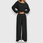 Μοντέρνο 2-κομμάτι σετ με αμάνικο φούτερ και φαρδιά παντελόνια με κορδόνι. Ιδανικό για ένα χαλαρό, αθλητικά κομψό look.