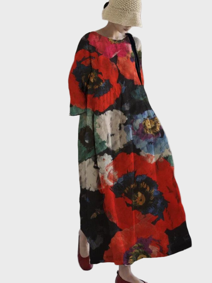 Το Νυχτερινές Παπαρούνες είναι ένα εκθαμβωτικό φόρεμα με έντονα λουλούδια σε μαύρο καμβά. Οι κόκκινες και μπλε παπαρούνες χαρίζουν ένταση και κομψότητα, ιδανικό για γυναίκες που αγαπούν τα statement κομμάτια και θέλουν να ξεχωρίζουν.