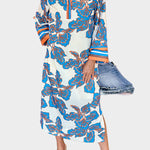 Ανανεώστε το στυλ σας με αυτό το άνετο και εντυπωσιακό καφτάνι σε εκρού βάση με έντονα μπλε και πορτοκαλί λουλουδένια μοτίβα. Η χαλαρή γραμμή του και η δροσερή υφή του υφάσματος το καθιστούν ιδανικό για ανοιξιάτικες και καλοκαιρινές εμφανίσεις.