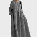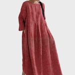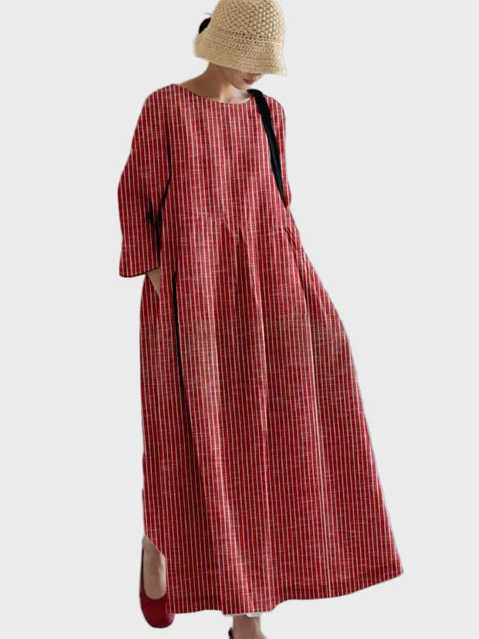 Δώστε μια αίσθηση διαχρονικής κομψότητας με αυτό το μακρύ φόρεμα σε κόκκινο χρώμα με κάθετες λευκές ρίγες. Η χαλαρή γραμμή και τα τρία τέταρτα μανίκια προσφέρουν άνεση, ενώ το μήκος του χαρίζει μια εκλεπτυσμένη και αέρινη εμφάνιση. Ιδανικό για casual αλλά και πιο κομψές περιστάσεις.