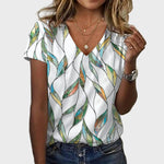 Αναδείξτε τη μοντέρνα πλευρά του στυλ σας με αυτήν τη μπλούζα σε λευκή βάση, διακοσμημένη με πολύχρωμα κυματιστά μοτίβα σε αποχρώσεις του πράσινου, του γαλάζιου και του χρυσού. Το ντεκολτέ σε σχήμα V χαρίζει θηλυκότητα, ενώ η χαλαρή εφαρμογή προσφέρει άνεση και κομψότητα για κάθε περίσταση.