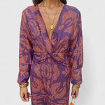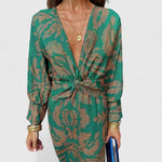 Δημητρούλα - Μίντι Φόρεμα με Στρίψιμο Μπροστά, Βαθύ V-Ντεκολτέ, Μακριά Μανίκια & Παϊσλέ Σχέδιο