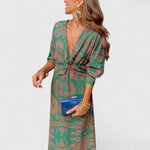 Το Δημητρούλα - Μίντι Φόρεμα με Στρίψιμο Μπροστά, Βαθύ V-Ντεκολτέ, Μακριά Μανίκια & Παϊσλέ Σχέδιο προσφέρει μια διαχρονική επιλογή που συνδυάζει στυλ και βιωσιμότητα για κάθε περίσταση.