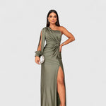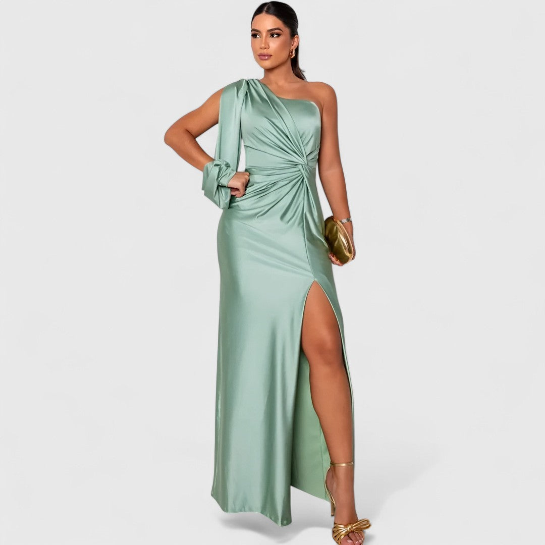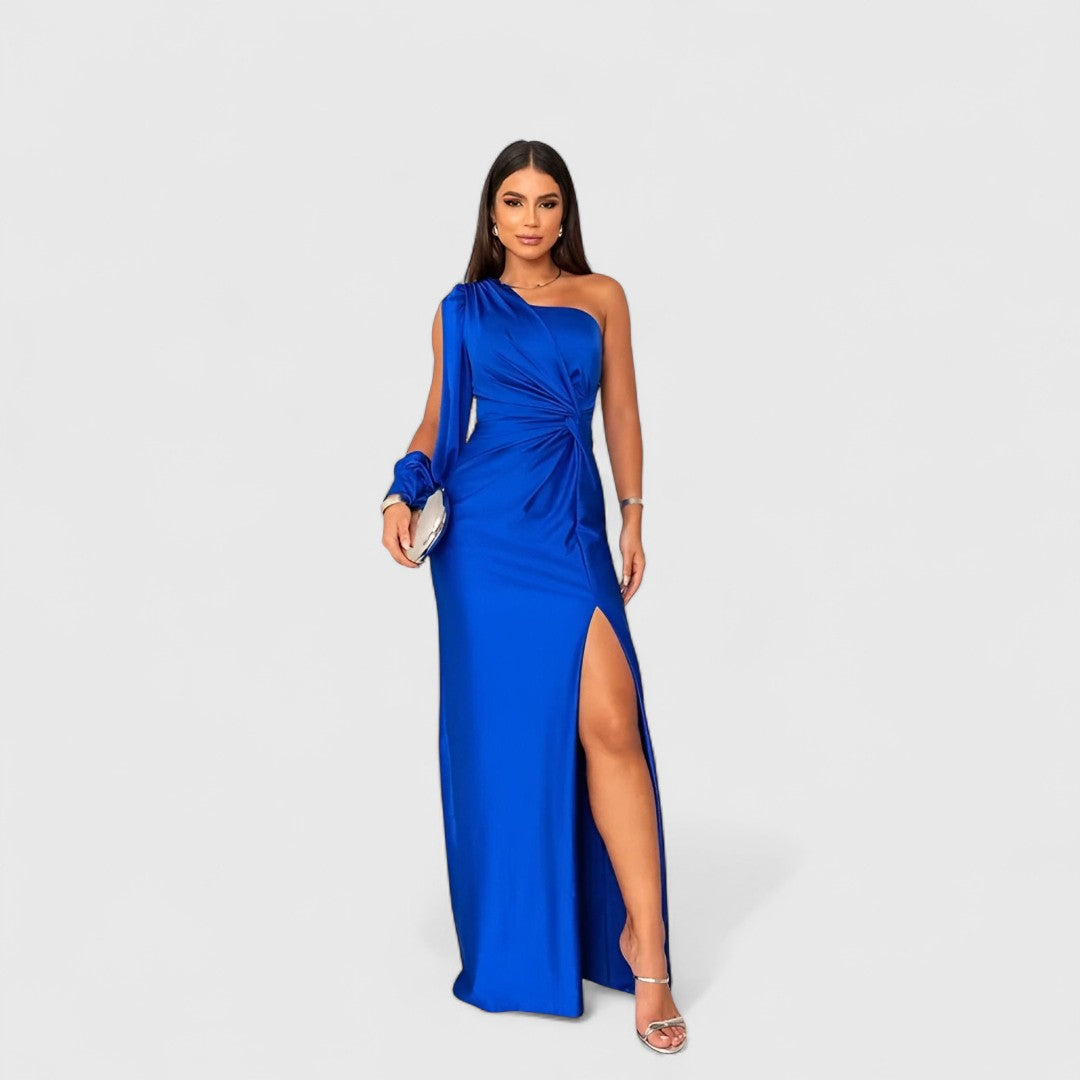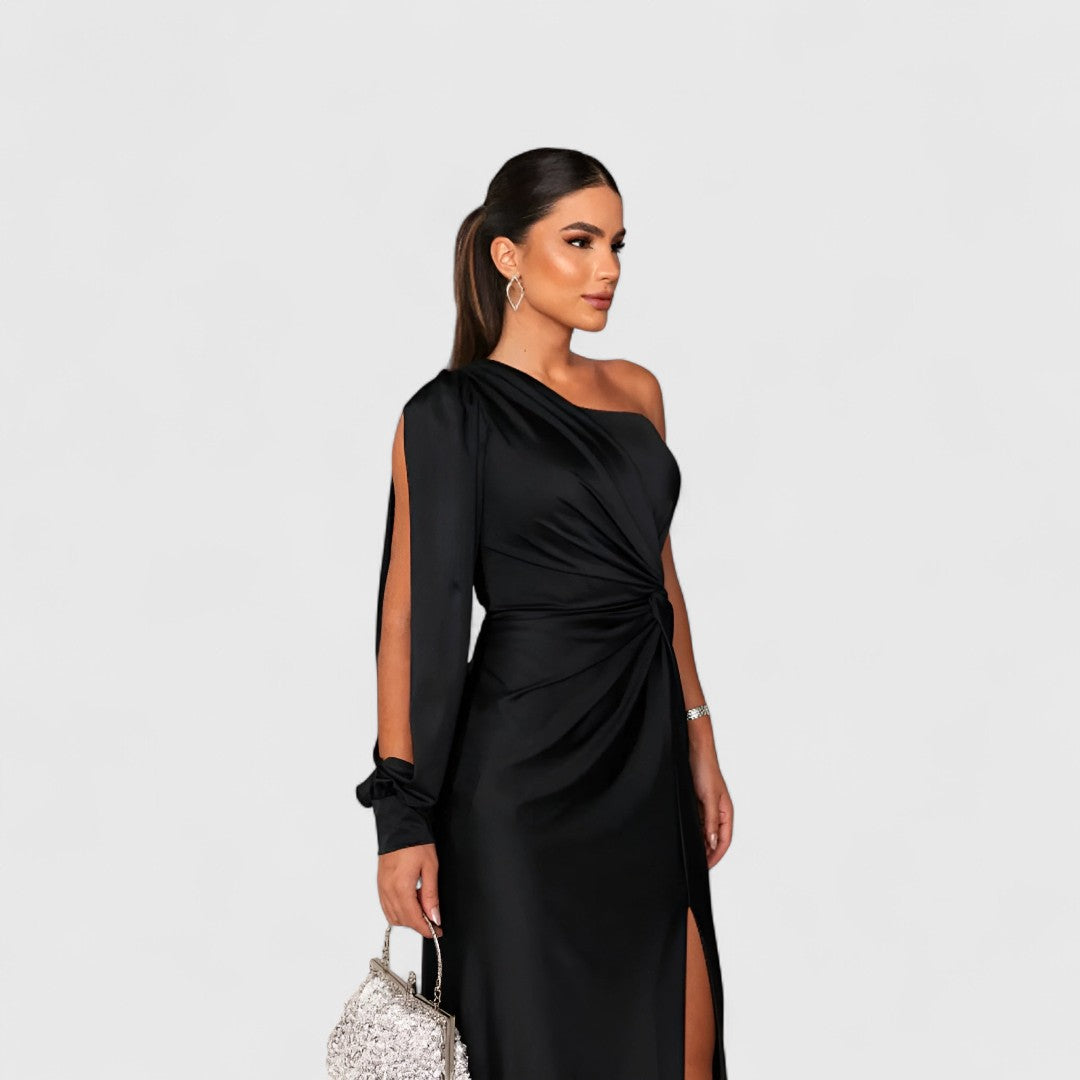 - Απόλυτη διαχρονική κομψότητα – το one-shoulder κόψιμο, οι κομψές πτυχώσεις και η πλευρική σχισμή αποπνέουν κλασική αίγλη.