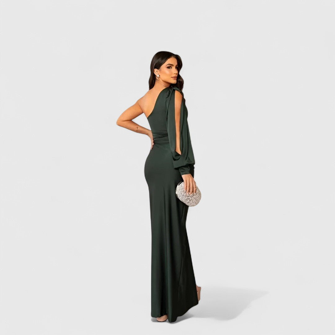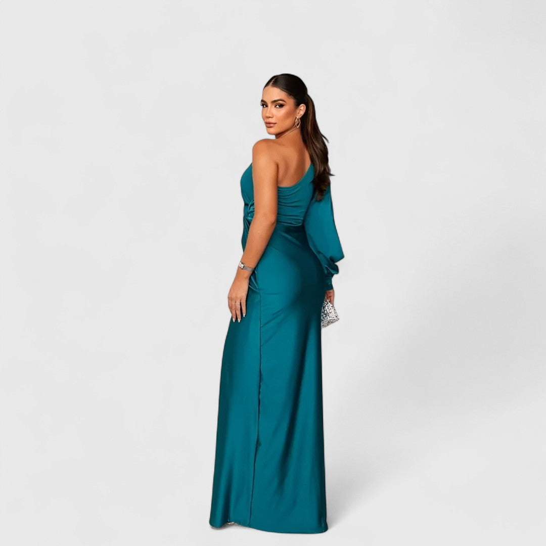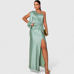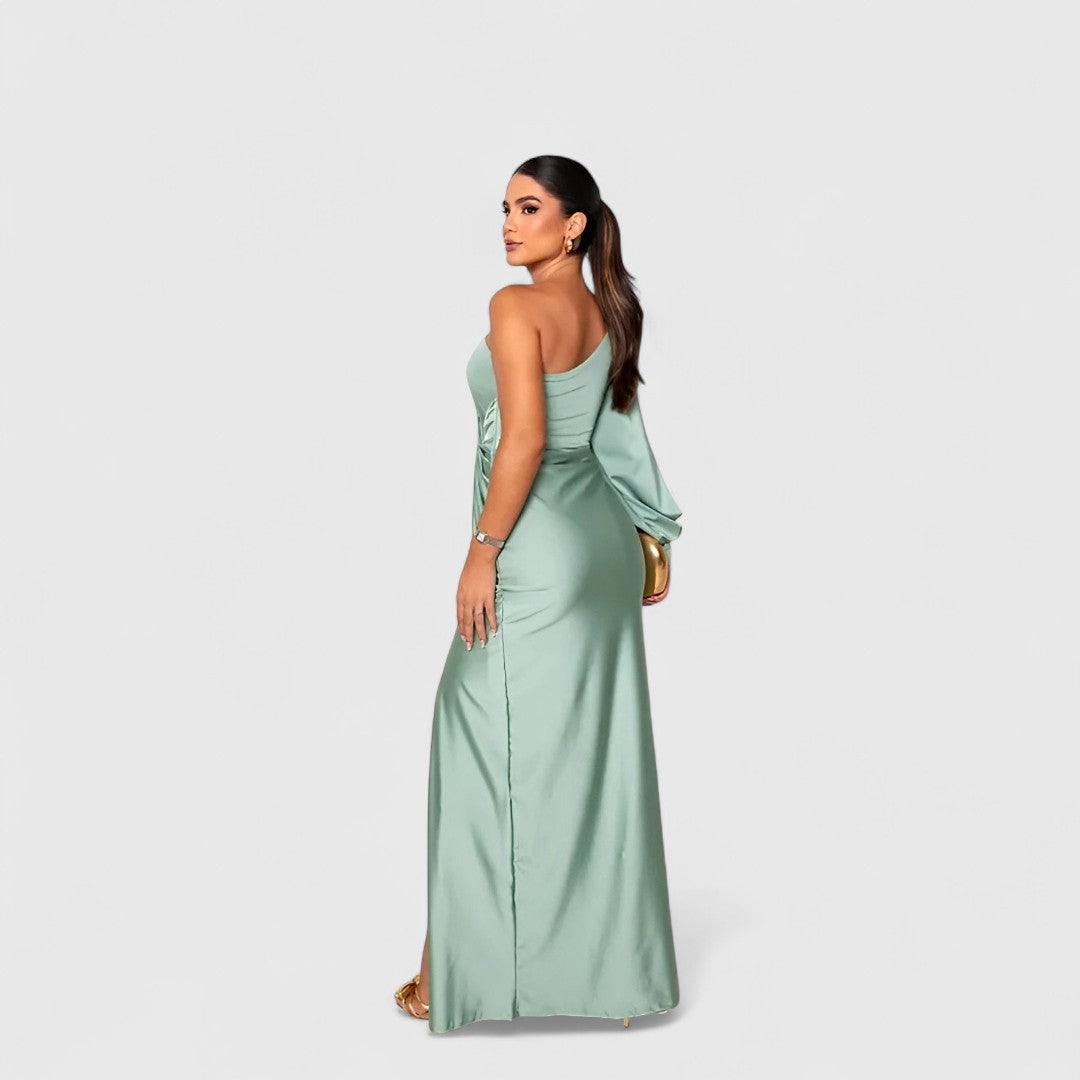 - Απόλυτη διαχρονική κομψότητα – το one-shoulder κόψιμο, οι κομψές πτυχώσεις και η πλευρική σχισμή αποπνέουν κλασική αίγλη.